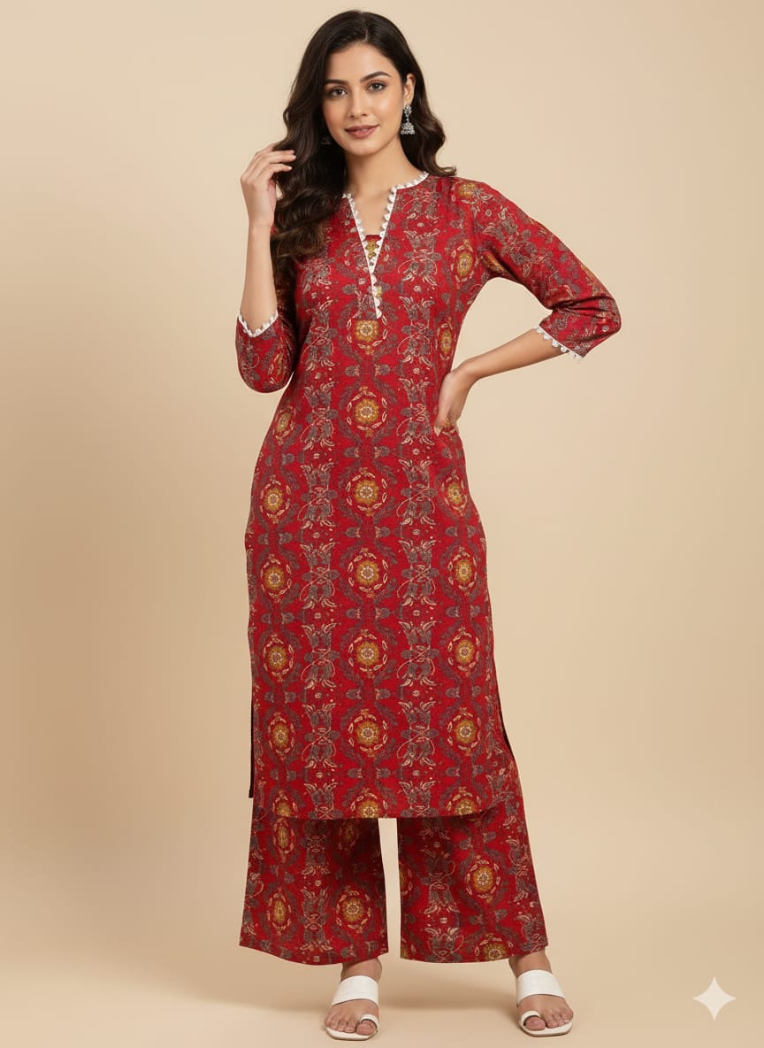 Embrace effortless style with this red printed cotton suit set. Crafted from breathable 100% cotton,...