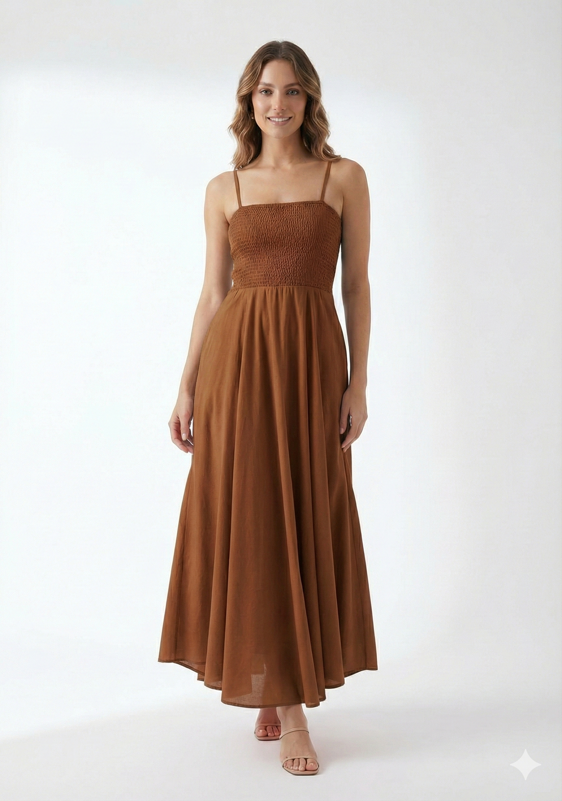 Women’s Rayon Brown Smocked Bobbin Gown with Spaghetti Strap