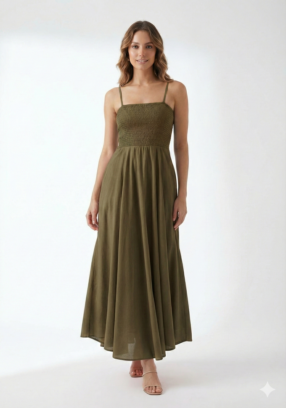 Women’s Rayon Mehandi Smocked Bobbin Gown with Spaghetti Strap