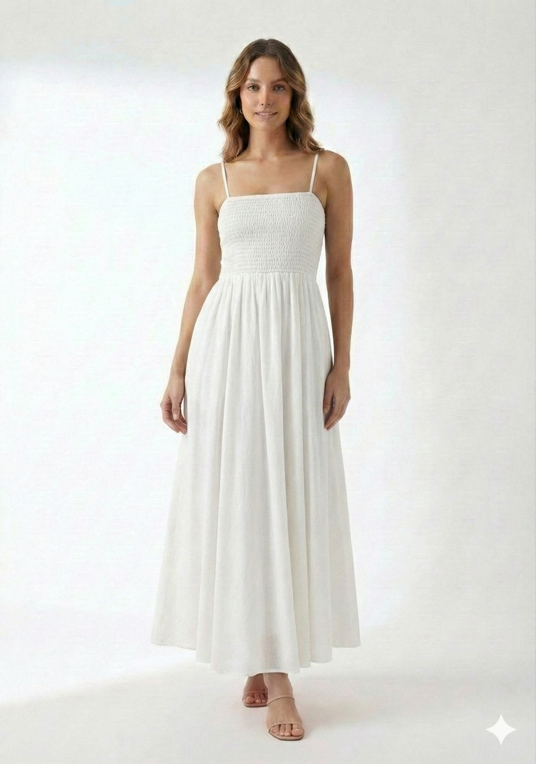 Women’s Rayon White Smocked Bobbin Gown with Spaghetti Strap