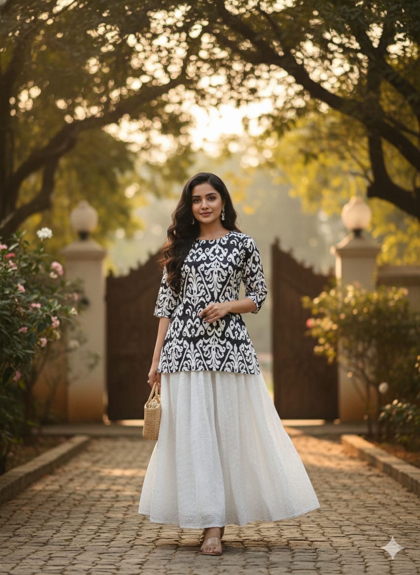 Women’s Black Ikat Printed Cotton Kurta with Chikankari Flared Skirt Set