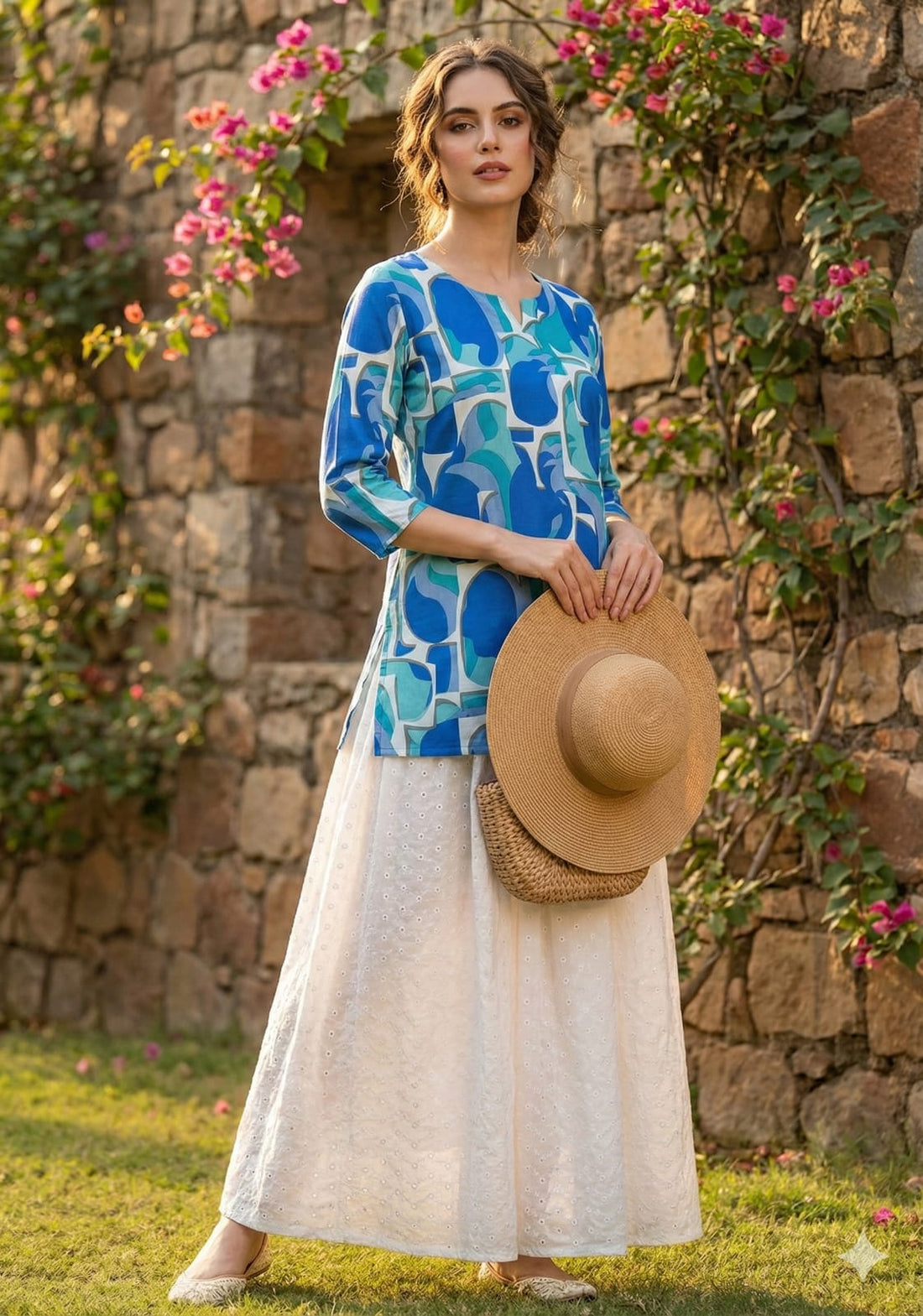 Women’s Blue Abstract Printed Rayon Kurta with Chikankari Flared Skirt Set