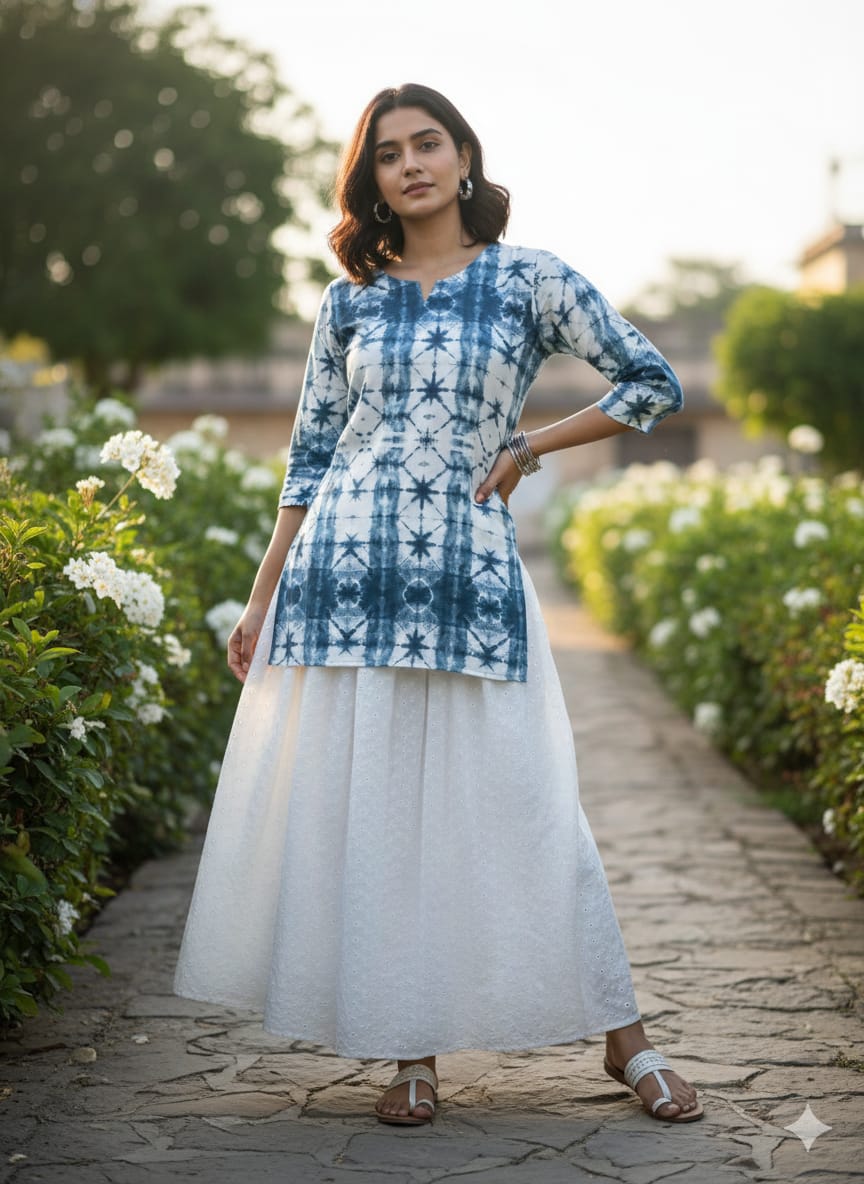 Elevate your ethnic wardrobe with this elegant indigo tie-dye kurta set, crafted from soft and...