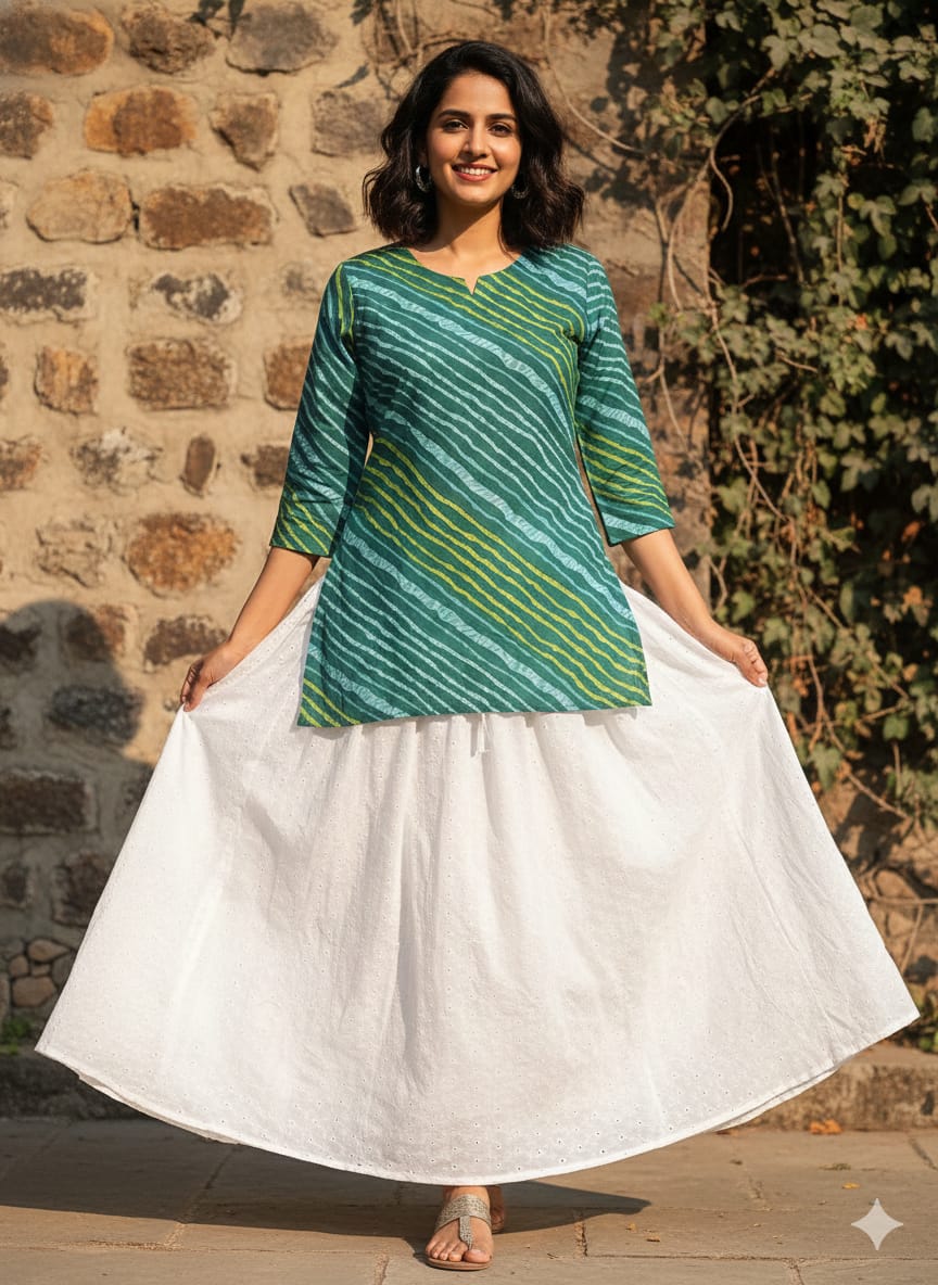 Women’s Green Leheriya Printed Cotton Kurta with Chikankari Flared Skirt Set