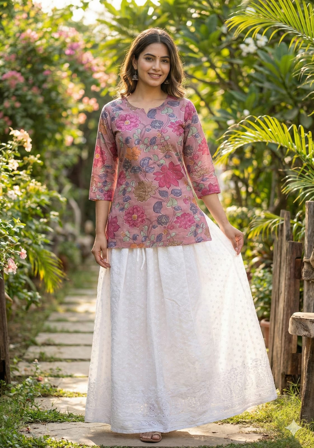 Women’s Floral Printed Cotton Kurta with Chikankari Flared Skirt Set