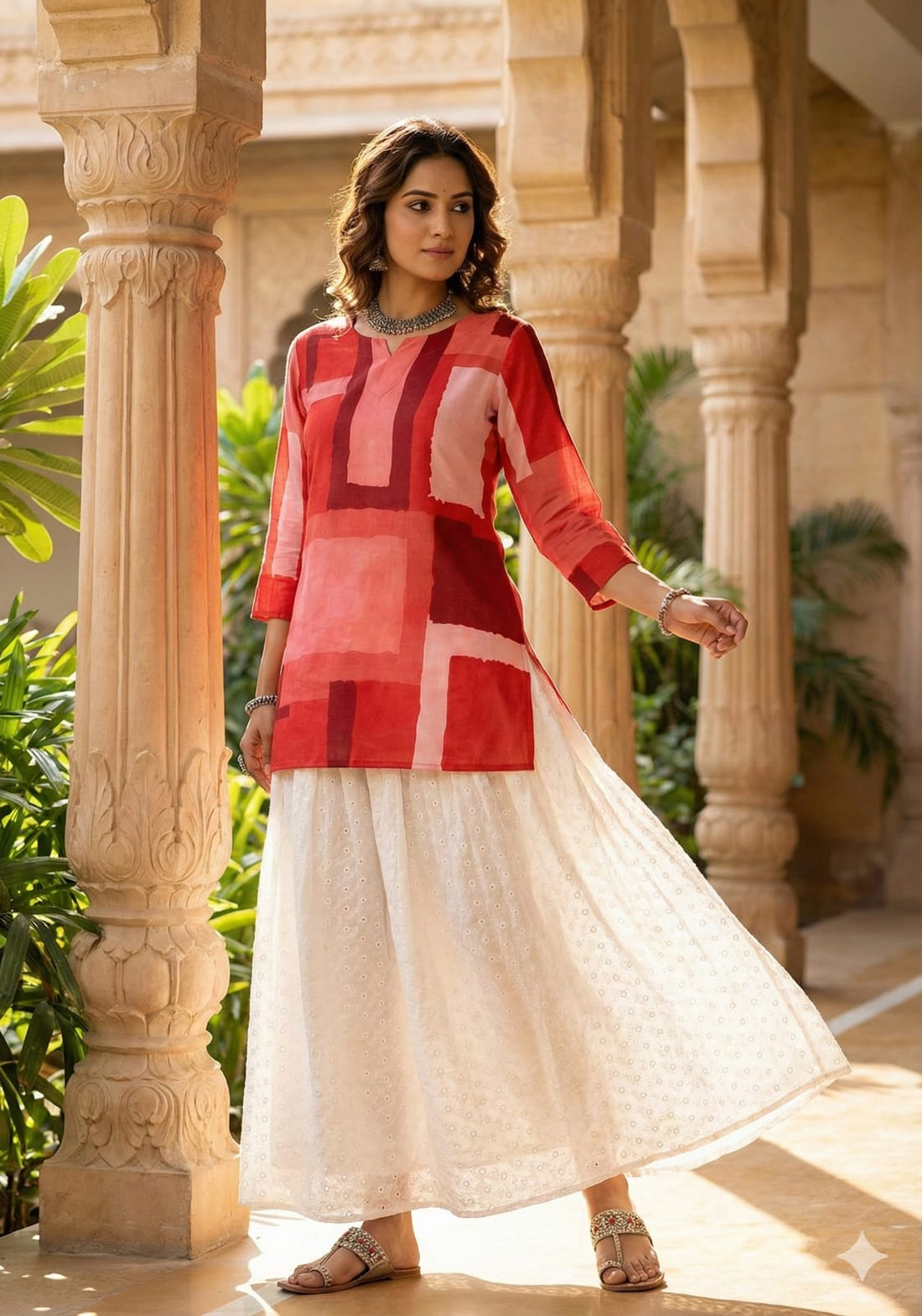 Women’s Red Abstract Printed Rayon Kurta with Chikankari Flared Skirt Set