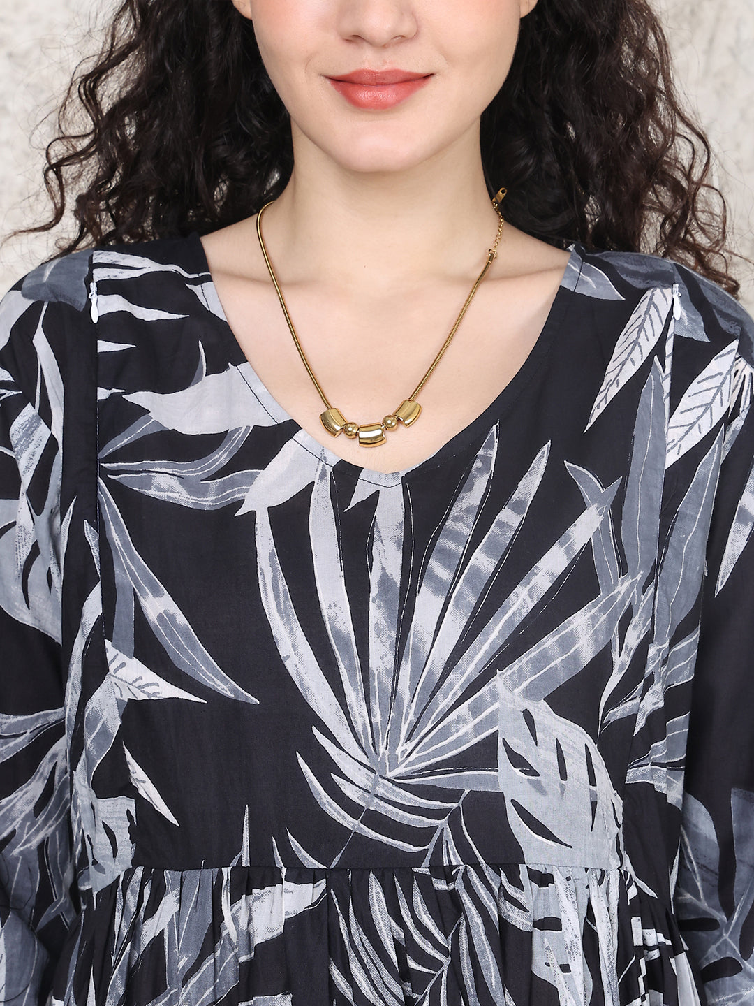 Aawari Black & Grey Leaf Print Cotton Maternity Dresses with Tiered Hem