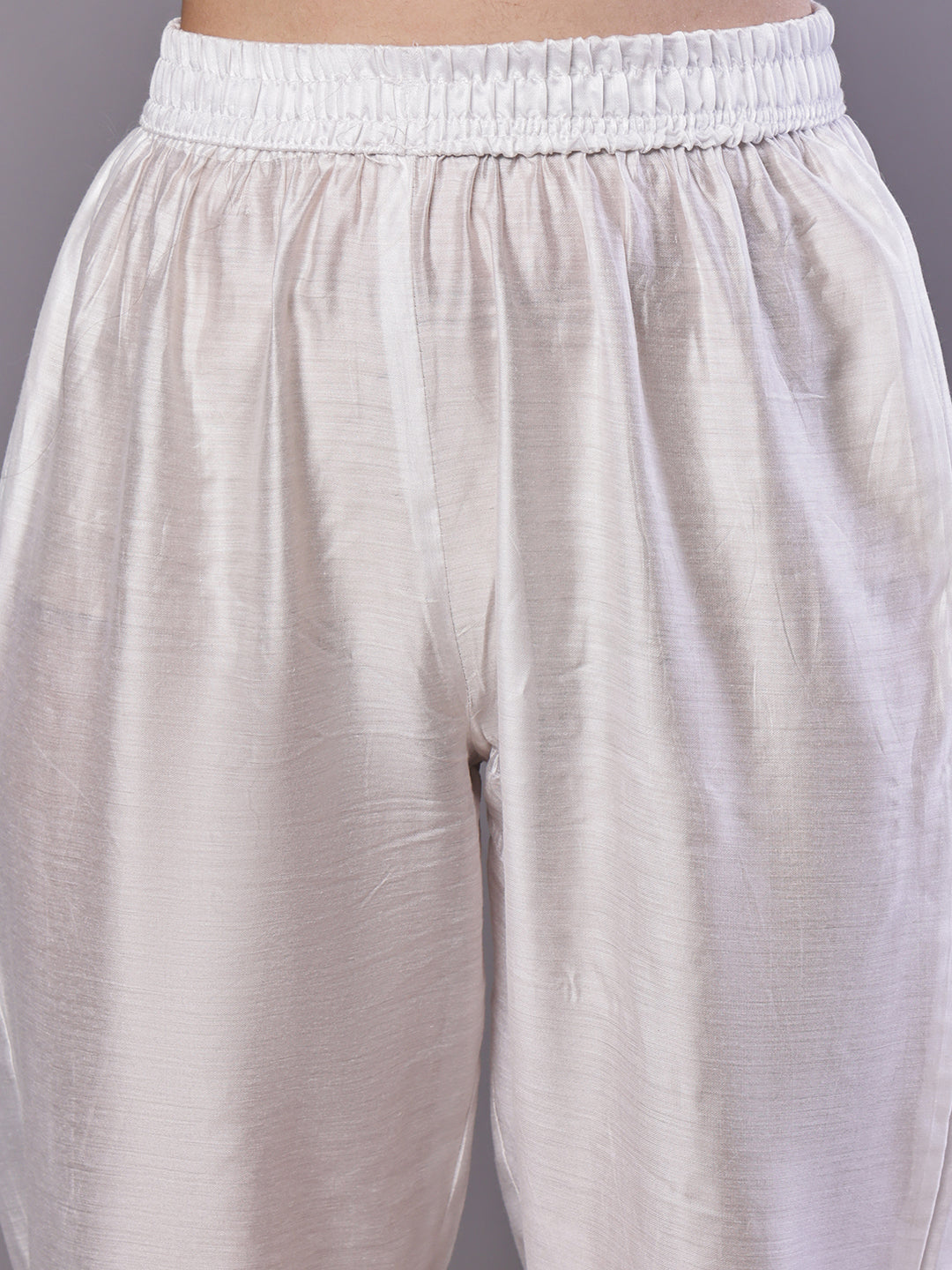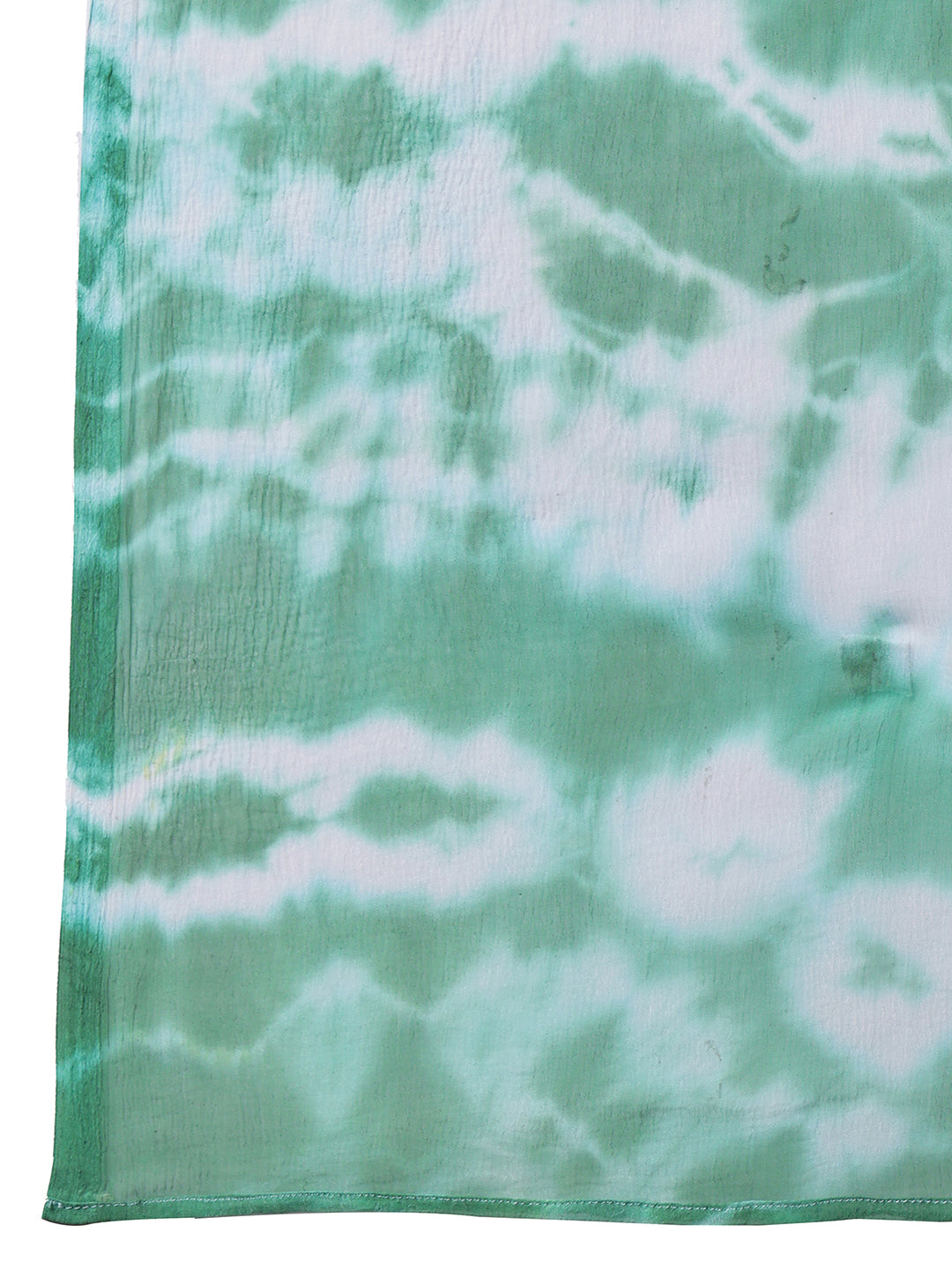 This elegant mint green kurta set is crafted from lightweight chanderi fabric, featuring intricate embroidery on the yoke for a refined look. The kurta showcases a subtle zig-zag woven pattern, paired with a tie-dye printed dupatta and solid white pants for a complete ethnic ensemble. Perfect for casual outings, festive gatherings, or office wear, this outfit blends comfort with traditional charm.