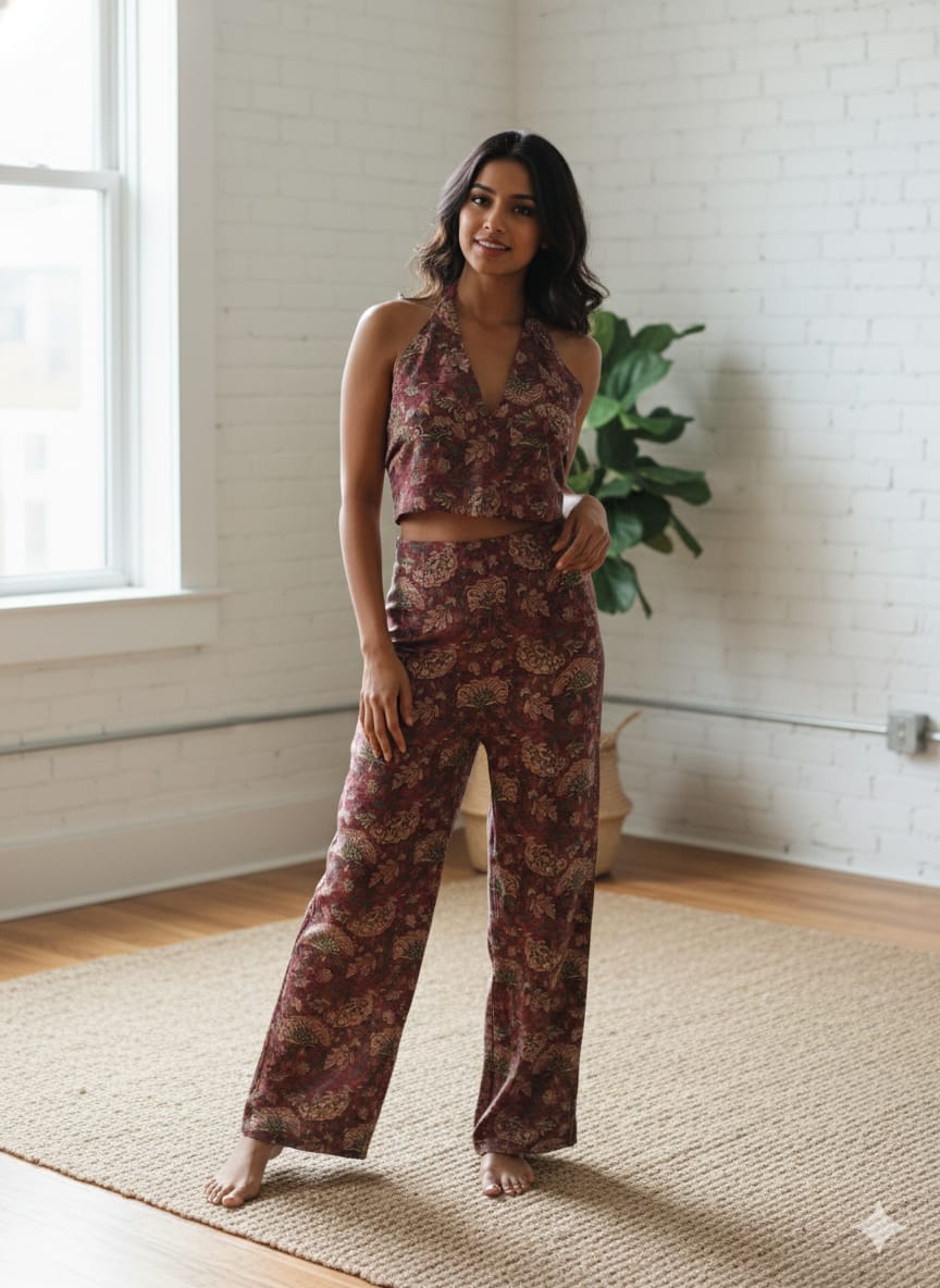 Elevate your wardrobe with this elegant floral Chanderi co-ord set, crafted for effortless sophistication. The halter neck crop top features a flattering V-neckline and a graceful backless tie-up design, while the high-waisted wide-leg pants offer a relaxed yet polished silhouette. Made from lightweight Chanderi fabric, this set is breathable, flowy, and perfect for day-to-evening styling. Ideal for brunches, festive gatherings, vacations, or contemporary ethnic looks.