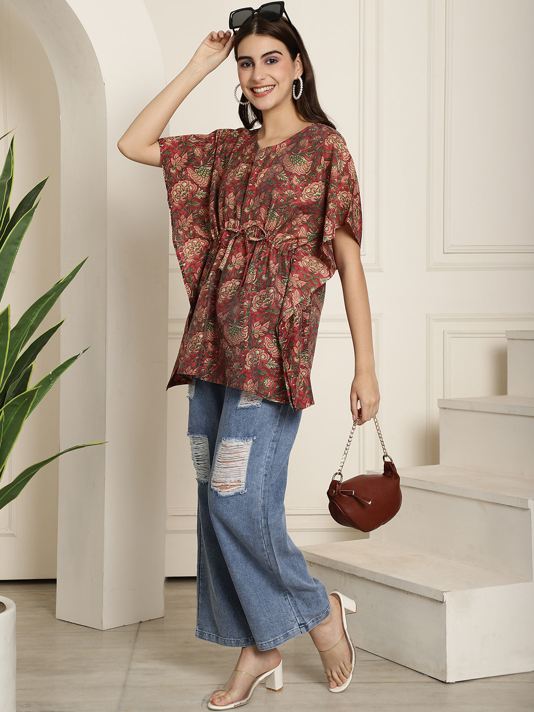 Bring timeless ethnic charm to your wardrobe with this Rust Red Floral Handblock Printed Chanderi Short Kaftan Top. Designed with elegant floral motifs inspired by traditional Indian prints, this top blends comfort and sophistication perfectly. Made from lightweight chanderi fabric, it features a V-neckline, short kimono sleeves, and an adjustable drawstring waist that flatters your silhouette while allowing a relaxed fit. Ideal for both casual and festive occasions, this kaftan top pairs beautifully with jeans, palazzos, or straight pants for a chic Indo-fusion look.